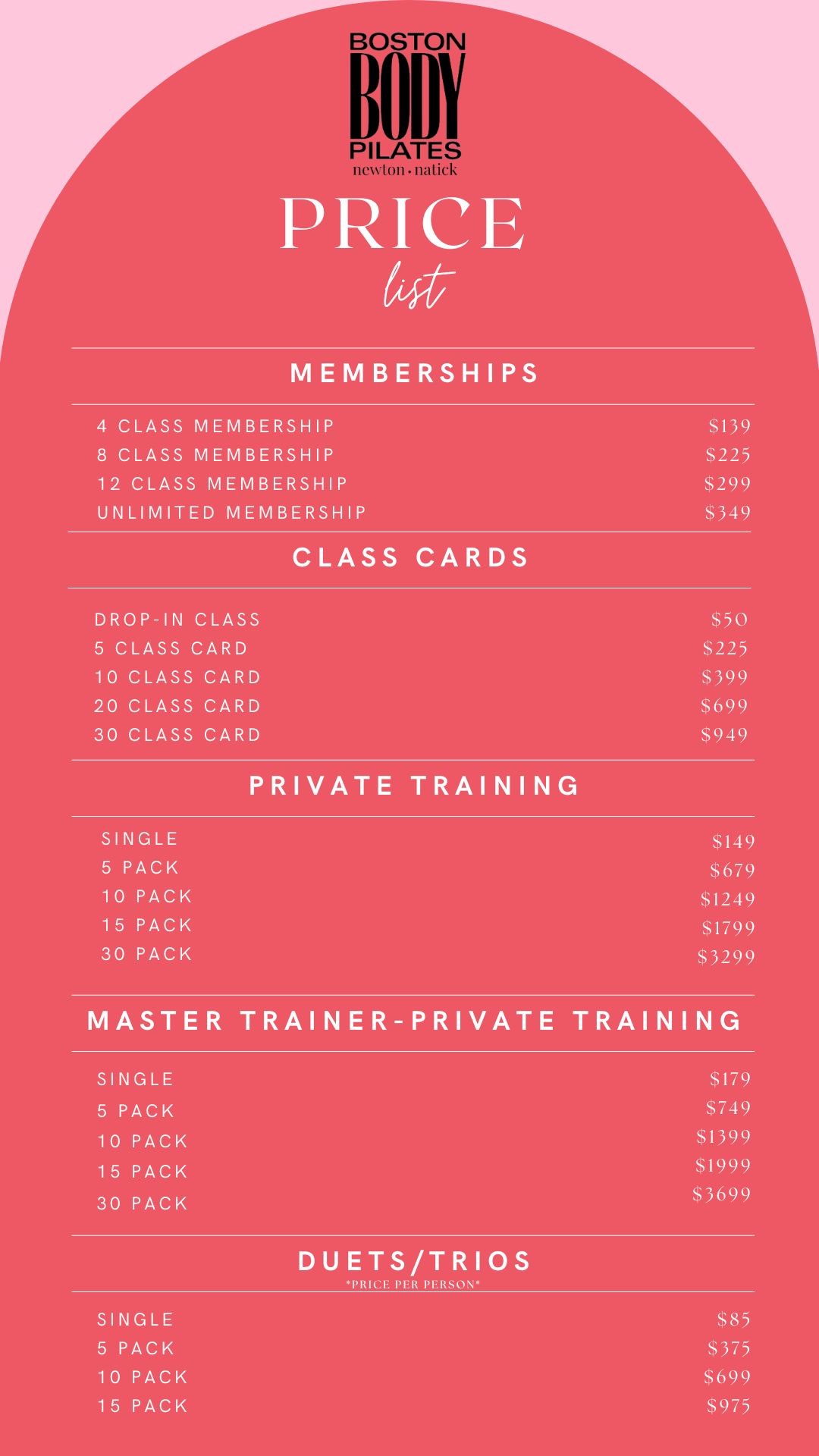 Boston Body's beautiful Newton storefront location has two floors. Enjoy large Group Class studios and a Private Training area. We offer Pilates Reformer, Mat & Barre.